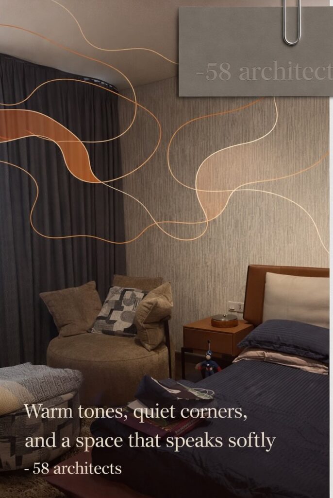 A soft, intimate bedroom designed with layered textures, warm colors, and a quiet reading corner. A space that feels calm, personal, and restful.