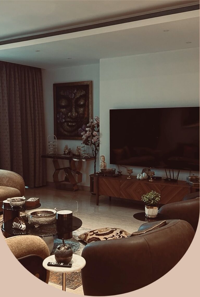A warm, contemporary living space designed with rich textures, earthy tones, and curated décor. The space balances comfort and sophistication, creating an inviting environment for everyday living.